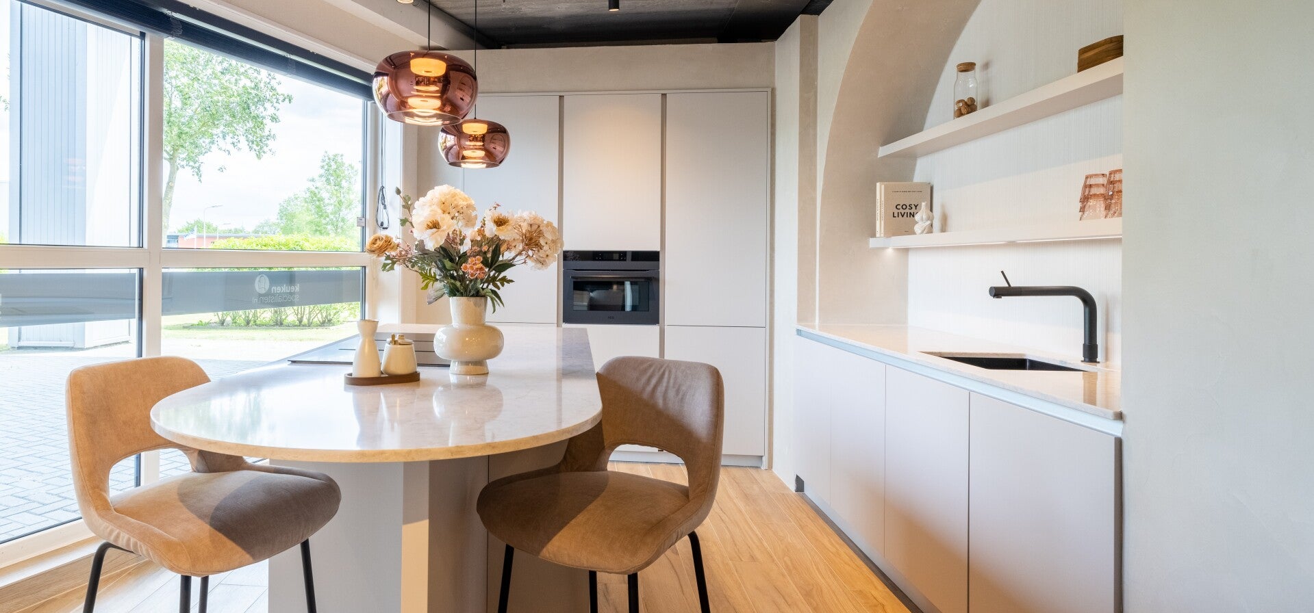 Voor de showroom van Baderie SK creëerde ik een sfeer waarin de hoogwaardige keukens volledig tot hun recht komen. Van het kiezen van karaktervolle werkbladen, stijlvolle kranen en bijpassende wasbakken tot het afstemmen van behang, raambekleding en tegelvloeren — elk element draagt bij aan een harmonieus en verfijnd geheel. De combinatie van warme materialen, uitgebalanceerde kleuren en een zorgvuldige styling maakt deze showroom niet alleen functioneel, maar ook esthetisch bijzonder. Het resultaat is een inspirerende ruimte die laat zien hoe doordacht design het verschil maakt — met oog voor detail, comfort en luxe.